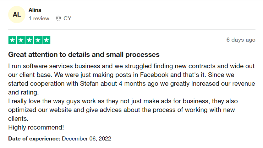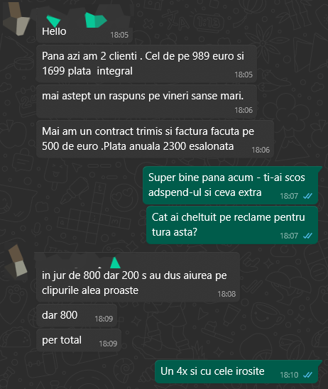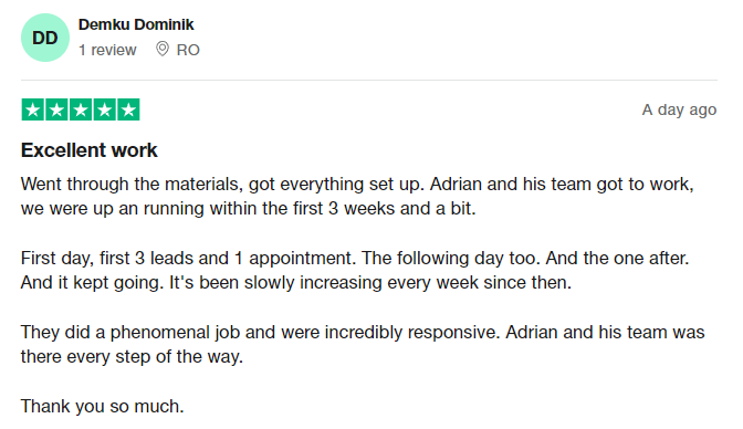 „După 12 zile, am semnat contracte cu 3 clienți noi după lansarea campaniilor. Asta e tot ce am avut nevoie pentru a ști că funcționează. Surprinzător de simplu, eficient și cu întreținere redusă.”